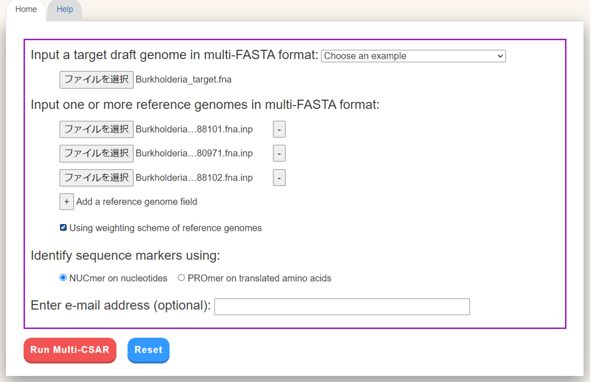 ターゲットゲノムドラフトをmulti-FASTA形式でアップロードする。さらに、リファレンスゲノムを1つまたは複数、multi-FASTA形式でアップロードする。プラスボタンをクリックすると、リファレンスゲノムのフィールドを追加できる。メールアドレスを入力すると、ジョブ終了後に 通知が届く。