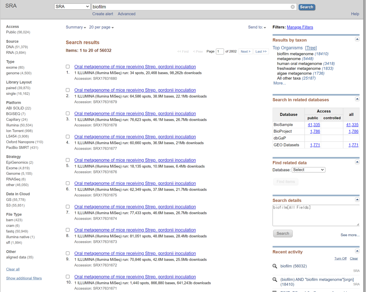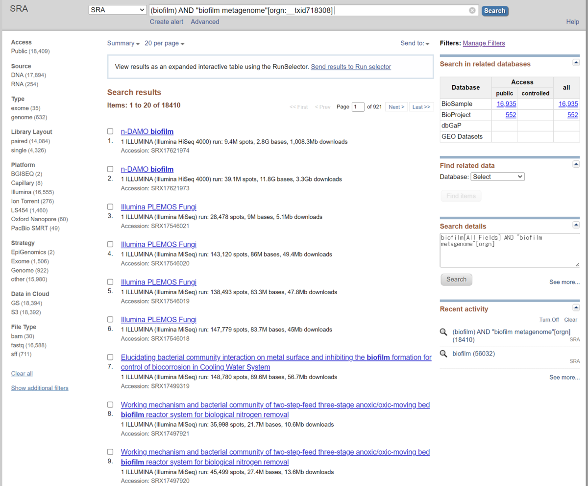 試してみる。biofilmのメタゲノムデータセットを探す。NCBI SRAでbiofimとタイプ。