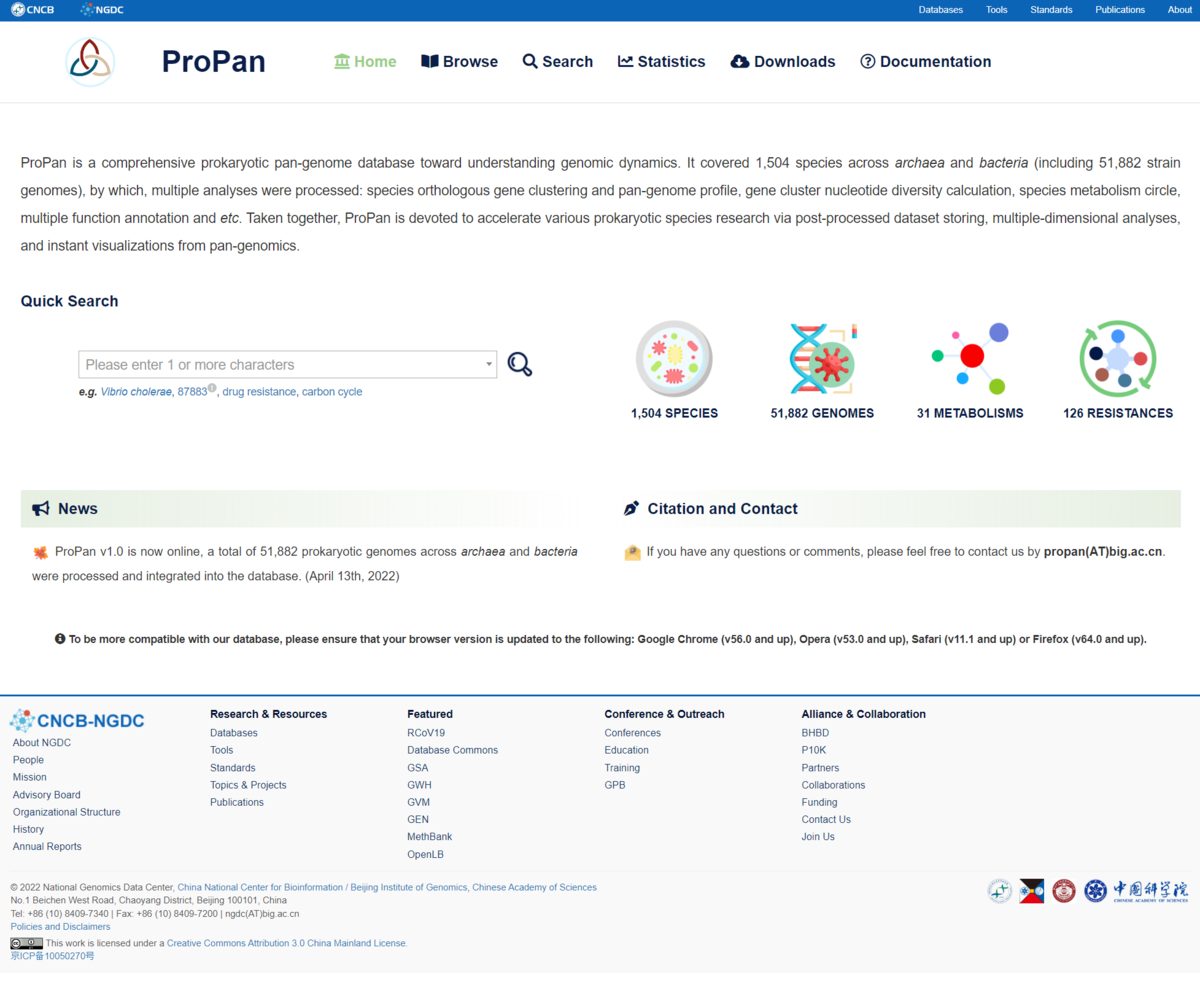従来の比較ゲノム解析と比較して、近年のパンゲノミクス研究は、種のゲノム動態、分類・同定、病原性、環境適応について、さらなる洞察をもたらしている。そこで、原核生物のパンゲノム動態を包括的にプロファイリングするために、古細菌23種、細菌1,481種(合計51,882株)を網羅した公開データベースProPan (https://ngdc.cncb.ac.cn/propan)を紹介する。ProPanは、これらの膨大なデータセットを解析・統合することで、対象種のパンゲノムダイナミクスに対して3つの主要な側面を提供する。1)パンゲノムダイナミクスにおける様々な種の特徴や構成の評価、2)含まれるすべての種の遺伝子クラスターに対するマップの関連性、機能アノテーション、存在/不在の変化の可視化、3)126のsubstances(殺菌剤、抗菌剤、金属)の耐性遺伝子予測や31代謝サイクルプロセスの評価などの環境適応の典型的な特徴。さらに、ProPanは非常に使いやすいインターフェース、柔軟な検索、多階層のリアルタイム統計的可視化機能を開発した。ProPanは、原核生物のパンゲノム動態、分類・同定、環境適応の研究において、重要なリソースとなるだろう。