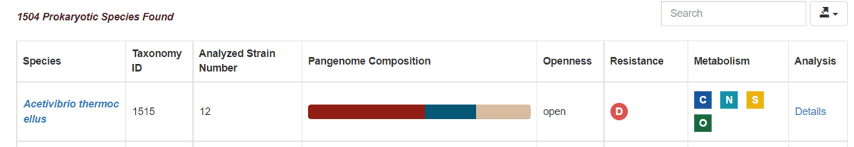 1つ見てみる。左端の種名はNCBI taxonomyにリンクしている。収録されている株数は12で(全て5以上)、中央のバーはコア遺伝子やユニークな遺伝子の割合を示している。openかcloseかも示されている(新しいゲノムを解析に加えたときに、新しい遺伝子ファミリーが検出される確率によって、オープンとクローズに分類される)。