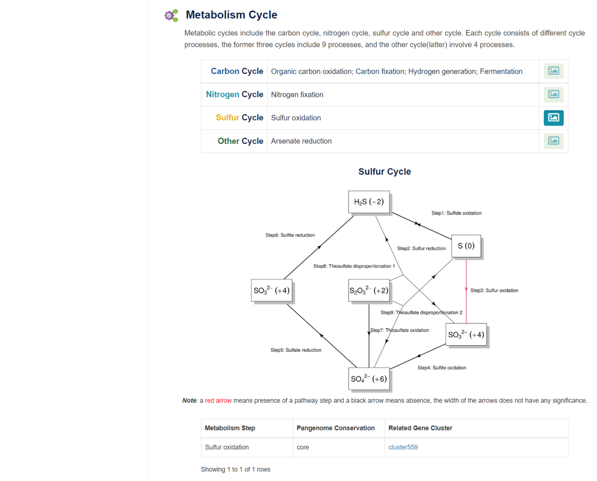 代謝サイクルには、炭素サイクル、窒素サイクル、硫黄サイクル、その他のサイクルがある。この細菌種には硫黄サイクルがcoreになっている。