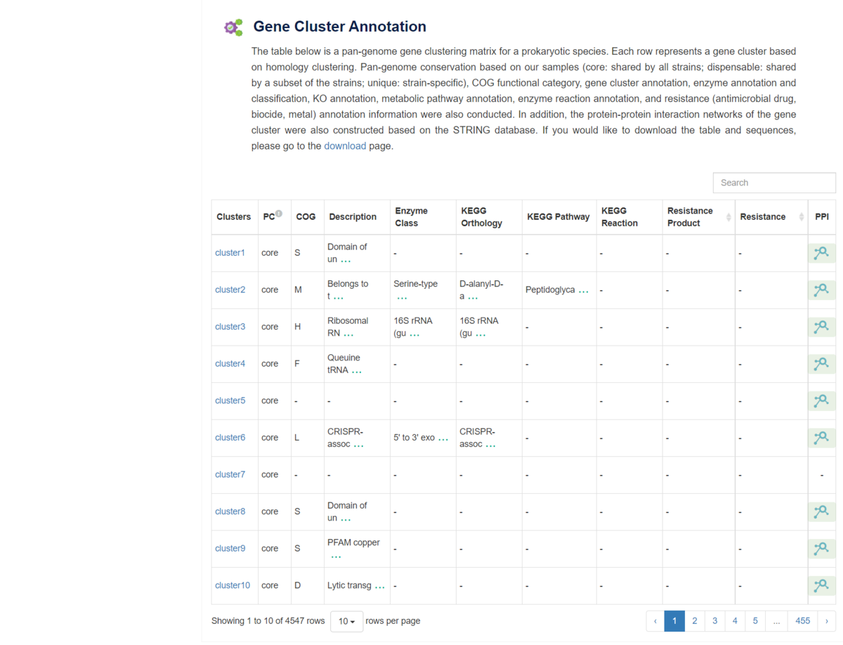 表は、全ゲノムの遺伝子クラスタリングマトリックスを表している。各行は相同性クラスタリングに基づく遺伝子クラスターを表している。各列には、その遺伝子クラスターが、コア遺伝子・dispensable 遺伝子・ユニーク遺伝子のいずれか、COG機能分類、遺伝子クラスタアノテーション、酵素アノテーションと分類、KEGGのKOアノテーション、代謝経路アノテーション、酵素反応アノテーション、耐性(抗菌薬、殺生物、金属)アノテーション情報がまとめられている。