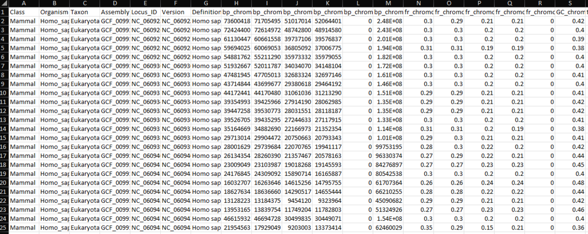 塩基頻度、ゲノムサイズ、またはGC含量、コドン使用率、Shannon entropy score、Chargaffの第2パリティルール(PR2)(二本鎖DNAの各一本鎖において、アデニン(A)の割合はチミン(T)とほぼ等しく、シトシン(C)の割合はグアニン(G)とほぼ等しいというもの(Rudner et al.1968))、ncRNA、tRNA、rRNA、最後にはtriplets(ATGやGTAなど)の出現頻度の列も含まている。GBRAPで説明されている。