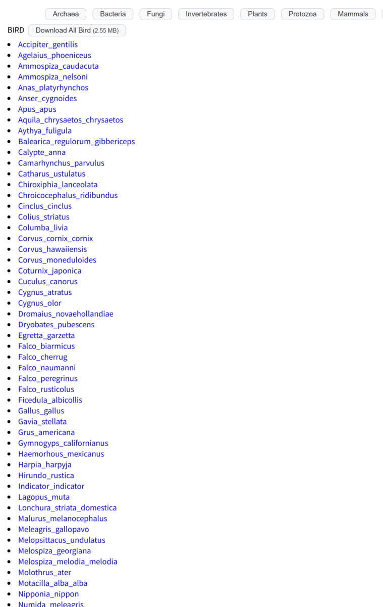 - scaffold'、'unlocalized'、'contig'、'unplaced'、'patch'、'unknown'のゲノムは、解析中に完全に削除されていて利用できない。このため、生物によってはミトコンドリアのデータしかない場合がある。